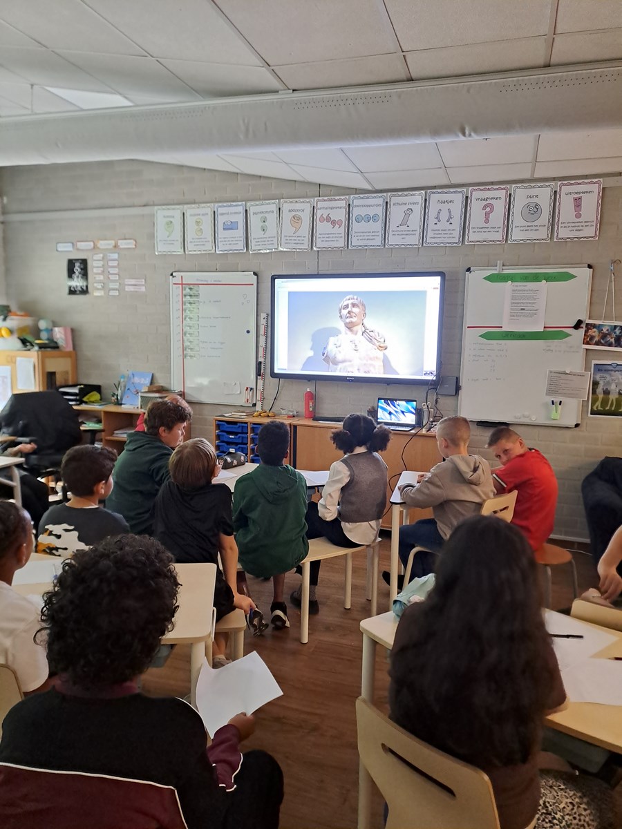 Bij groep 7 is een online tour gevolgd door het museum van de oudheden. Er was een live verbinding met een medewerker van het museum die vragen stelde aan de leerlingen over de Romeinse tijd. Super leuk en leerzaam!