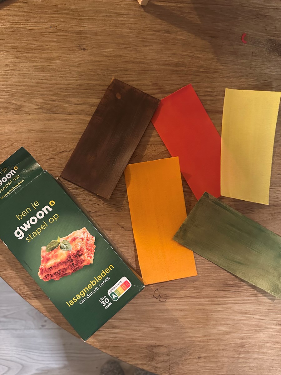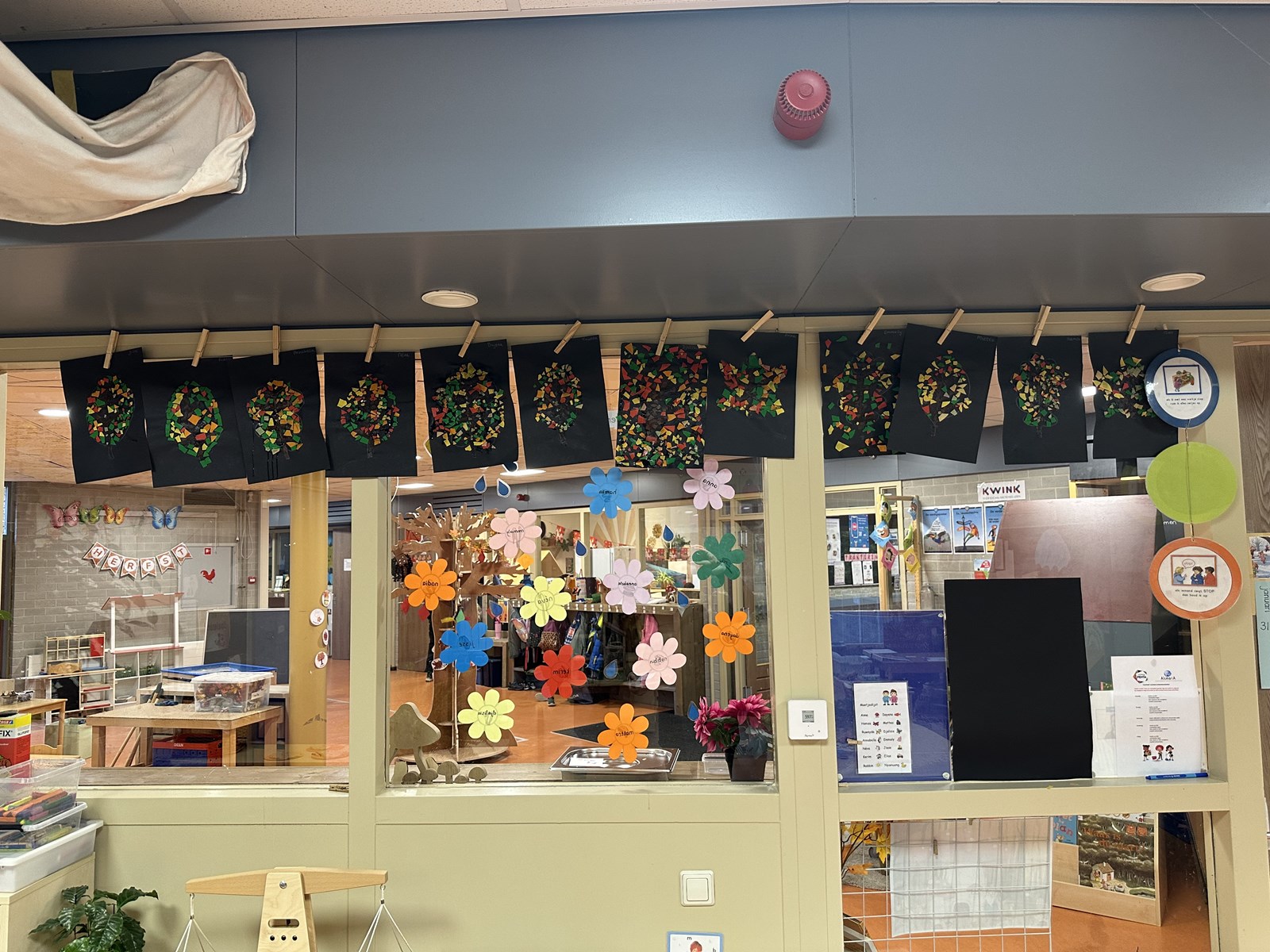 We hebben hier gewerkt aan verschillende leerdoelen. Eerst hebben we met elkaar benoemd welke kleuren we zien in de natuur rond de herfst. De leerlingen gingen de geschilderde lasagnebladen in kleine stukjes breken: fijne motoriek! Daarna gingen zij de stukjes op het voorgetekende bladeren plakken. Wederom fijne motoriek maar ook ruimtelijk inzicht! (Past er nog iets tussen? Een kleine of een grote?)