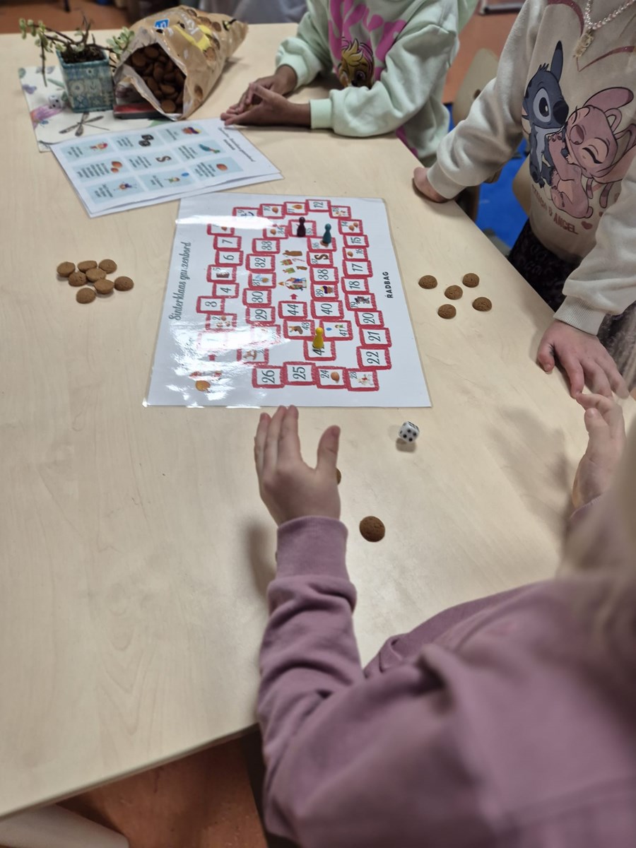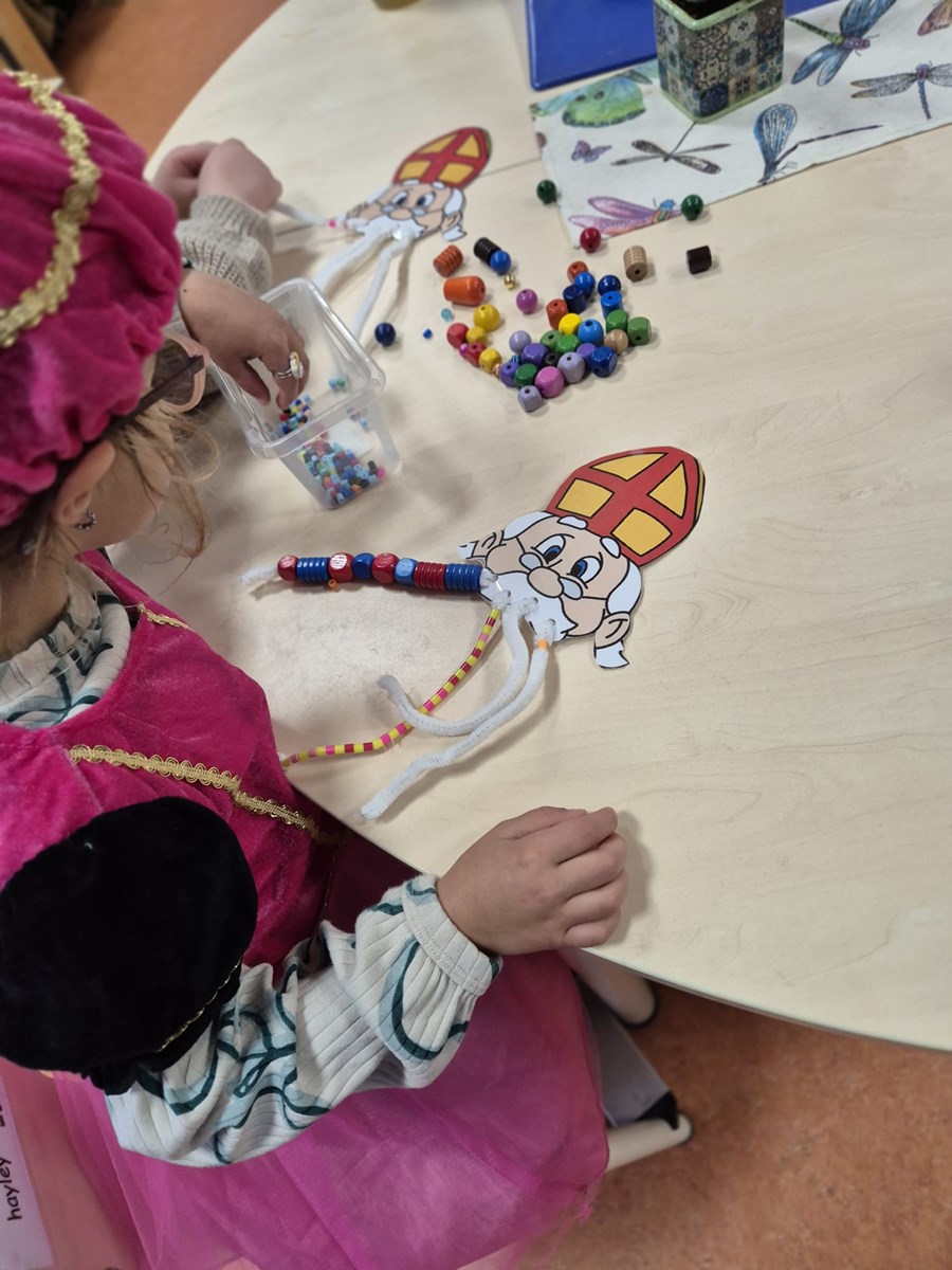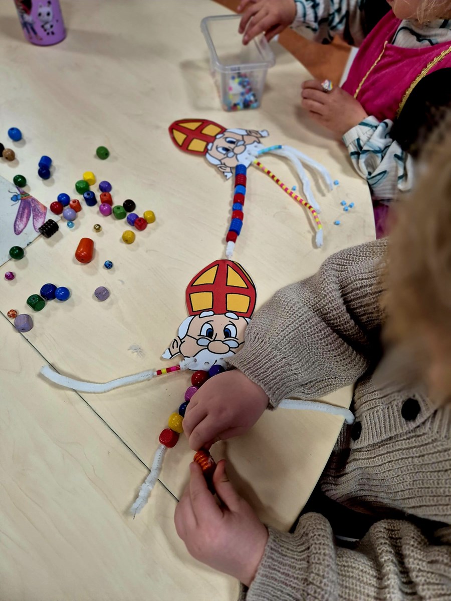 De kleuters zijn enthousiast aan het spelen en werken met het Sinterklaas thema: sinterklaas ganzenbord met pepernoten, varen op de grote stoomboot in de hal, verkleden als sint en piet in de huishoek, pakjes verven op het grote schilderbord en in de schrijfhoek worden Sinterklaasboekjes gemaakt.