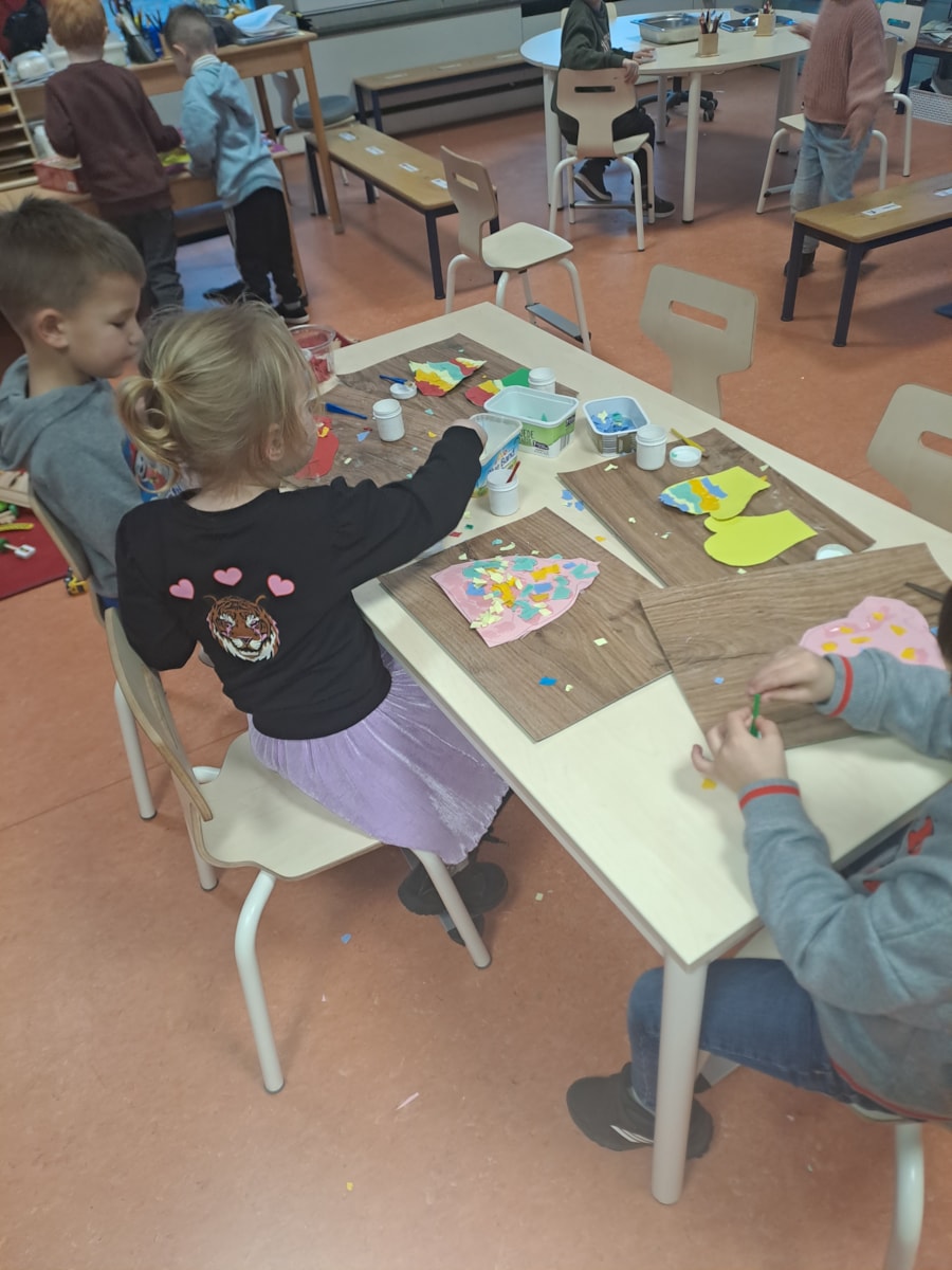 De kleuters zijn lekker bezig met het maken van een muts of wanten of een mooie puzzel.