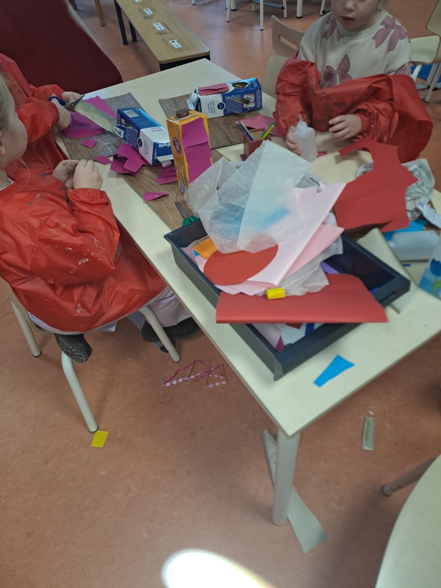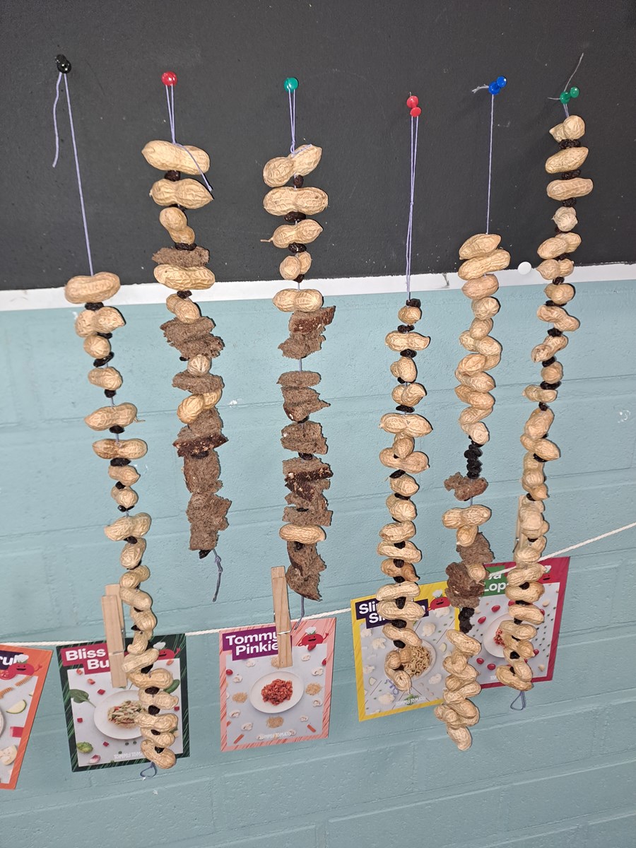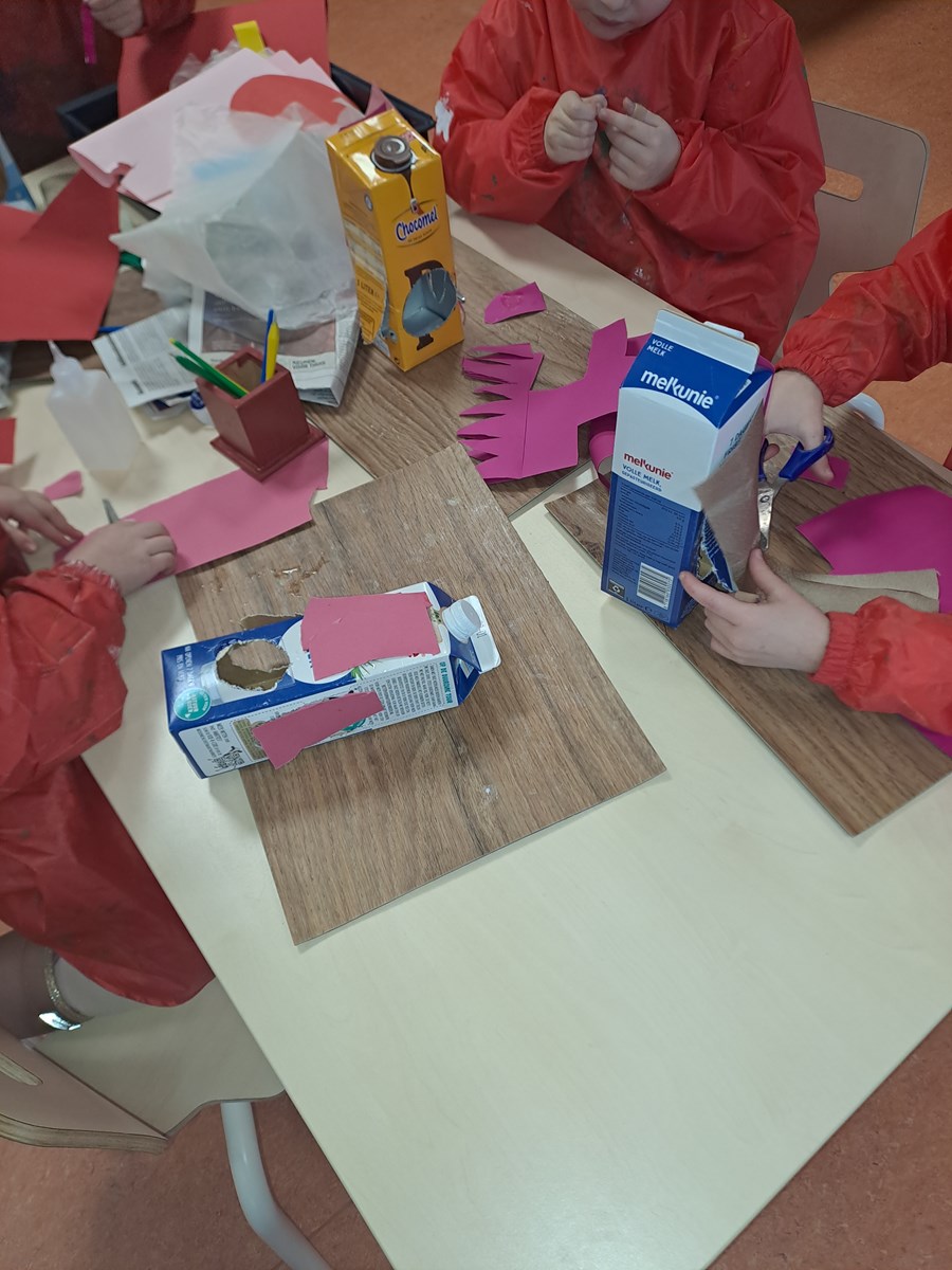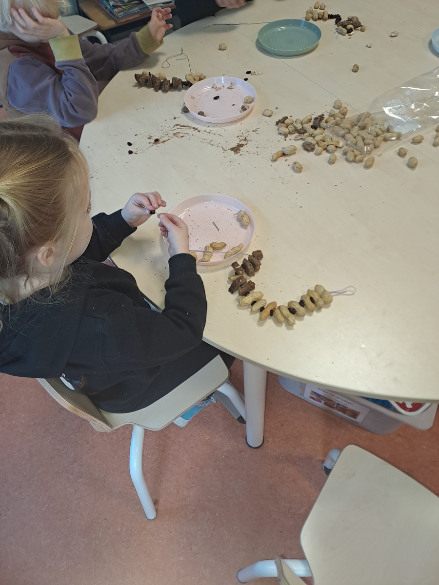 De kleuters helpen de vogels in de winter: er wordt een vogelhuisje gemaakt en een ketting geregen van brood, rozijnen en pinda’s.