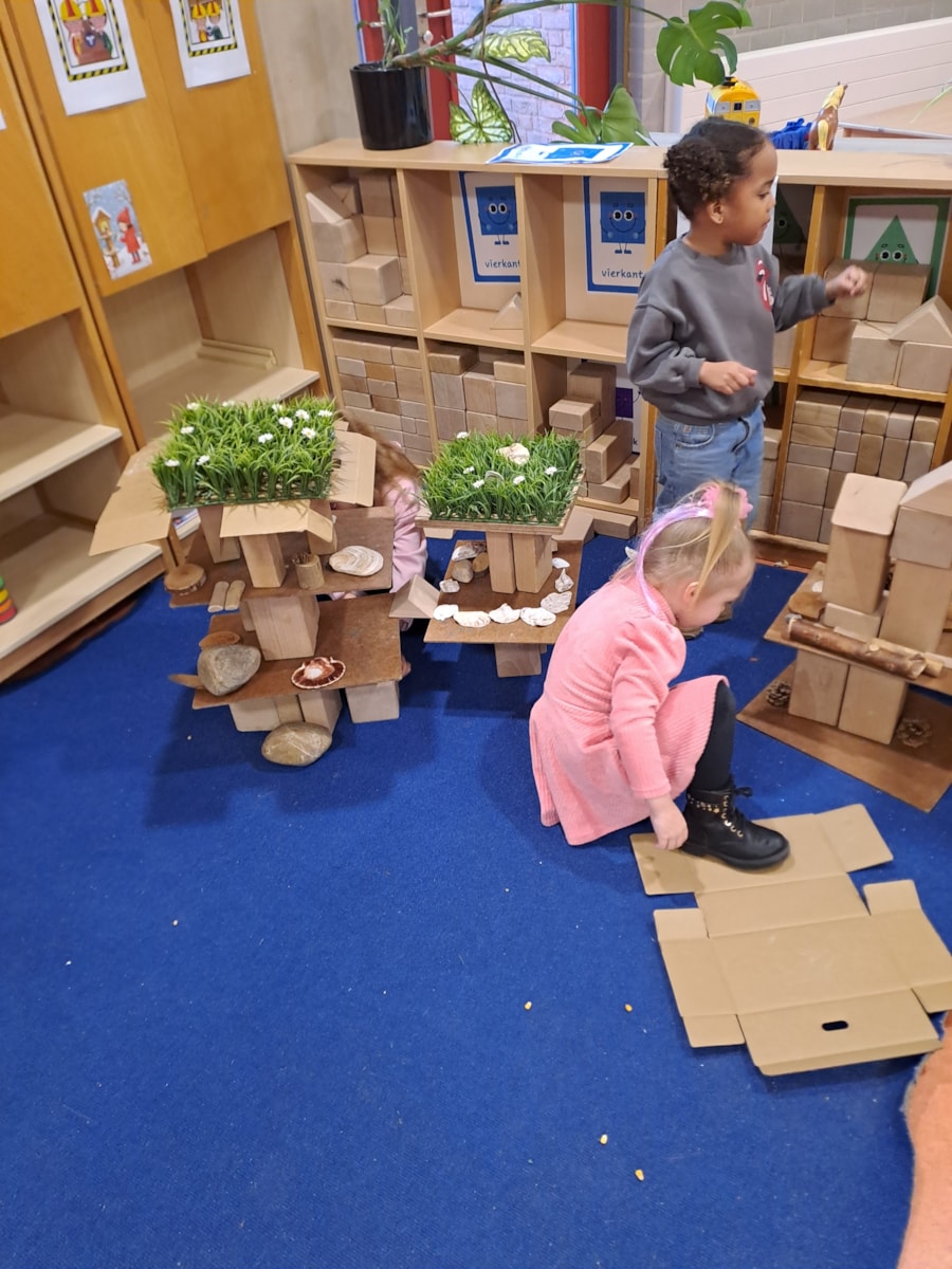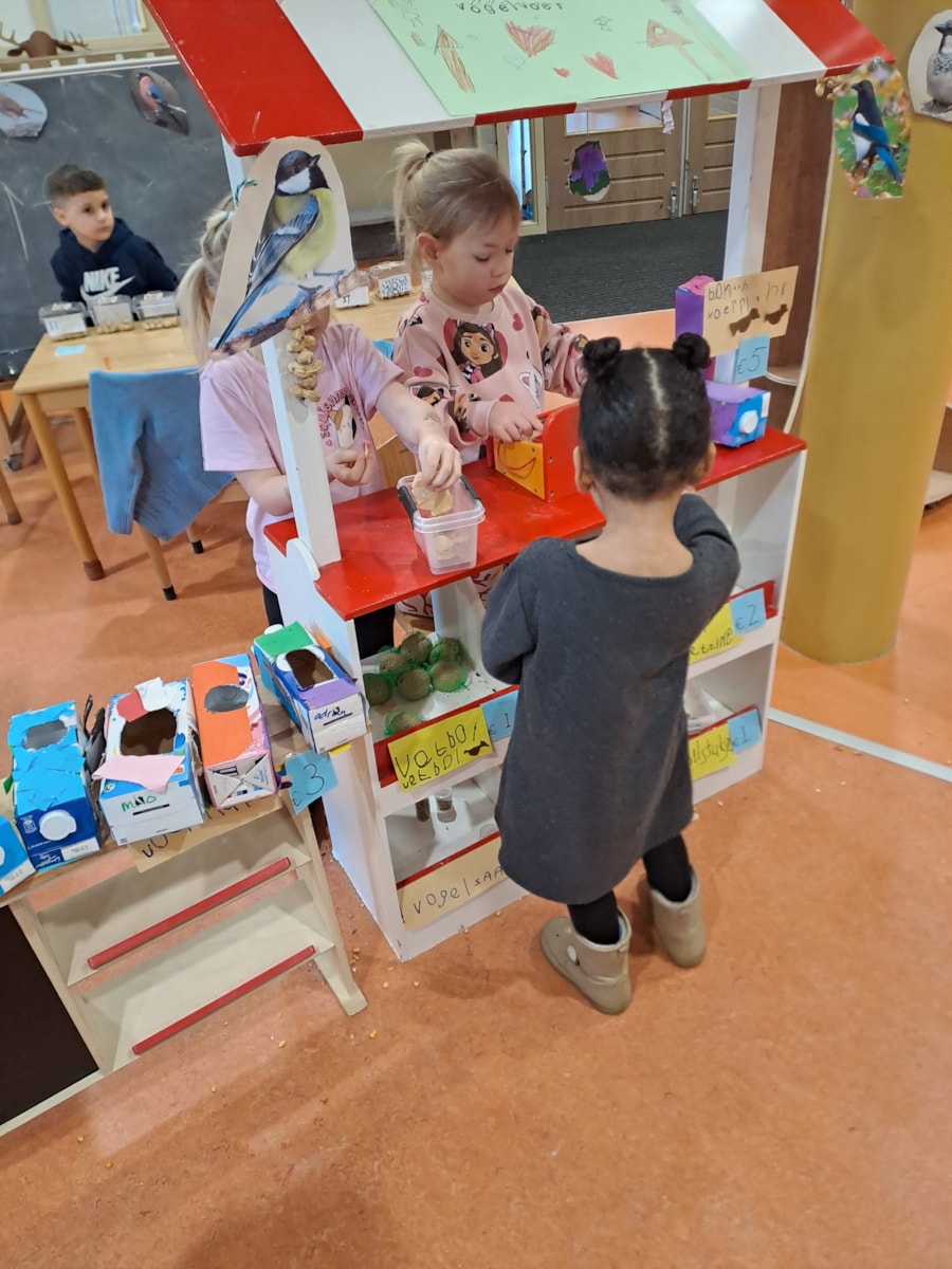 In de kleuteraula wordt gewerkt aan het thema vogels. Er worden mooie vogelhuisjes gemaakt in de bouwhoek. En er is een winkeltje waar divers vogelvoer gekocht kan worden.