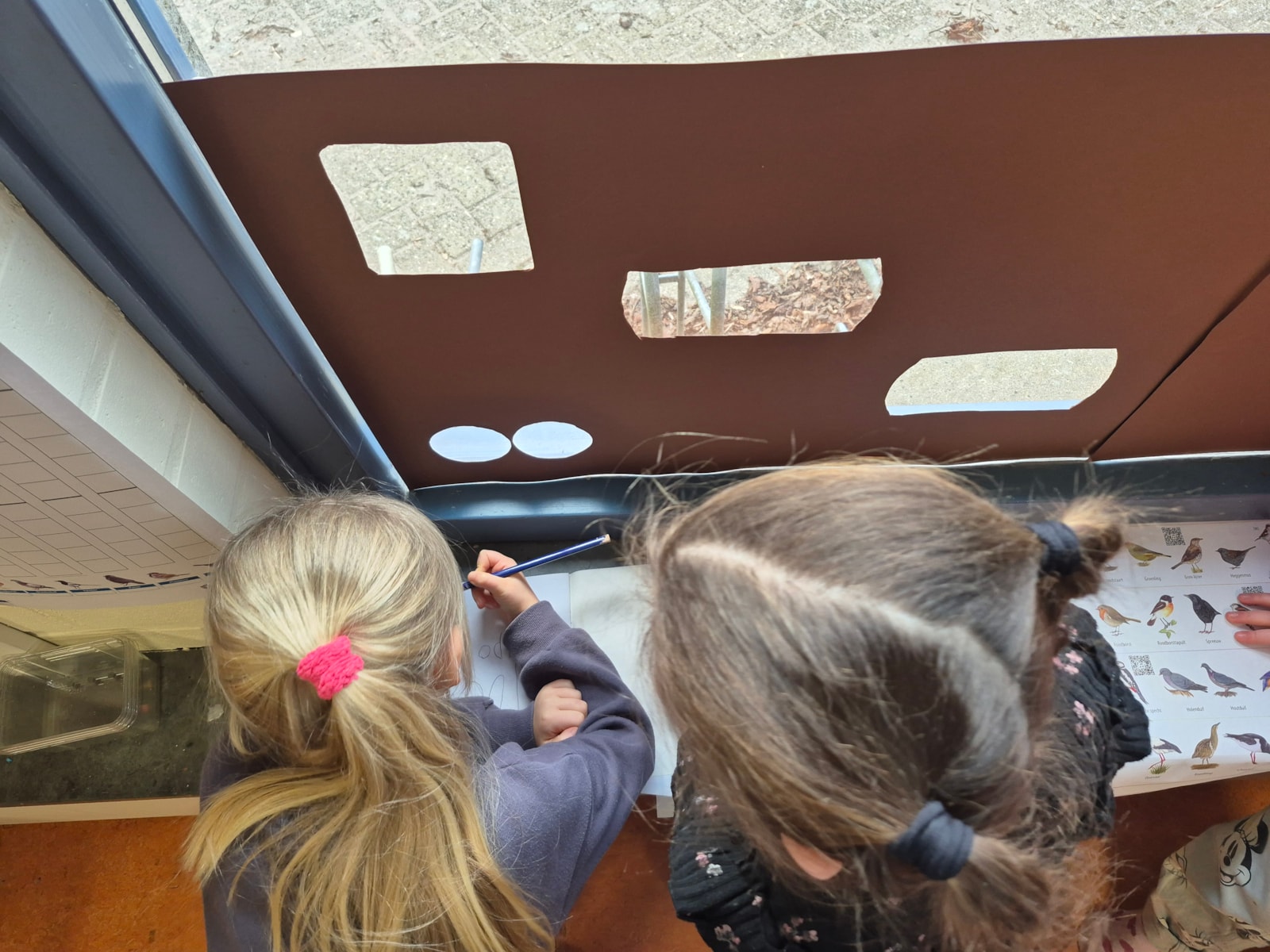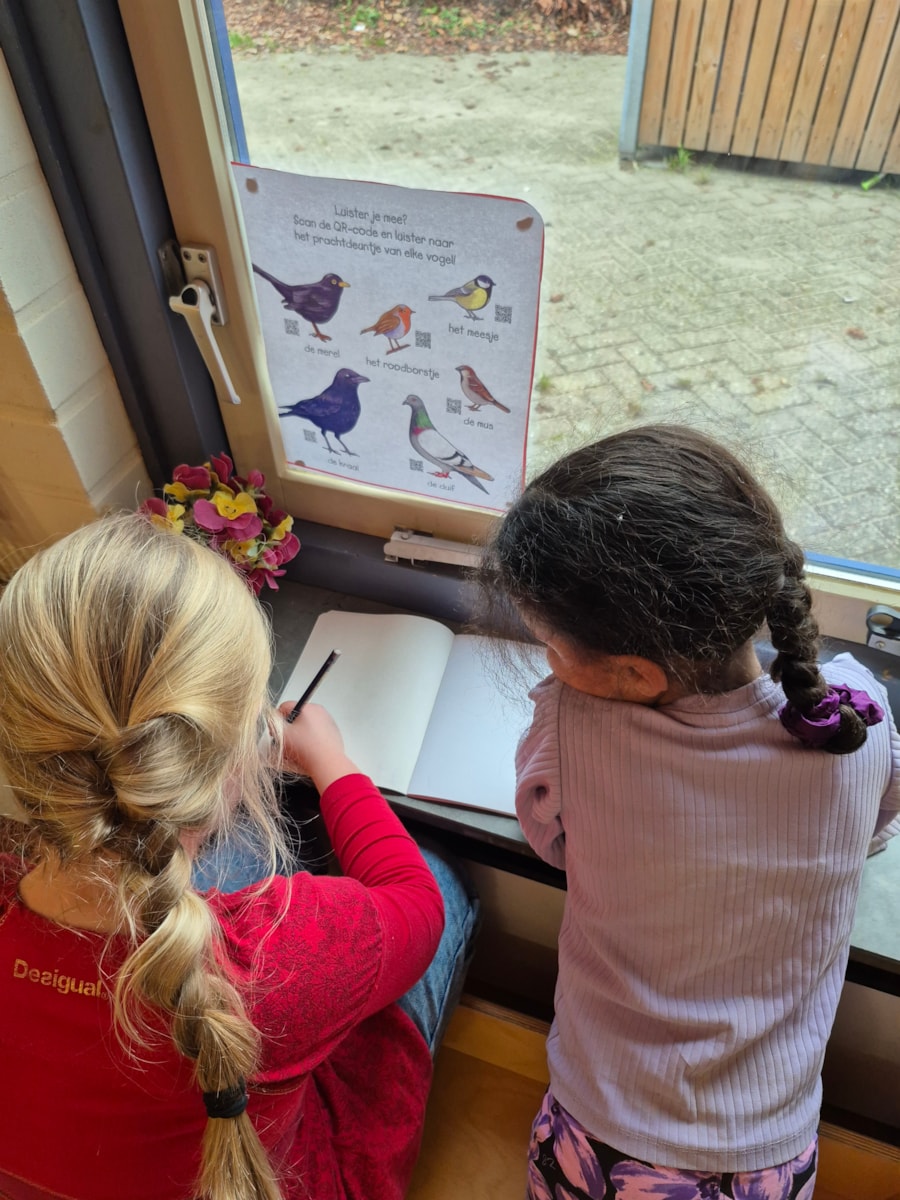 Schilderen en vogels spotten vanuit de vogelkijkhoek. De namen van de vogels worden opgeschreven en bijhouden in een schriftje.