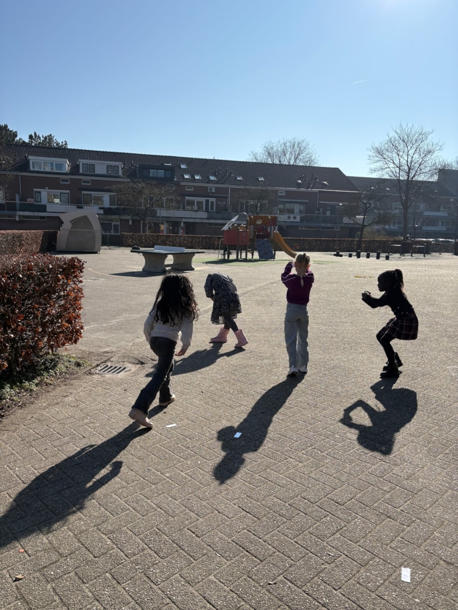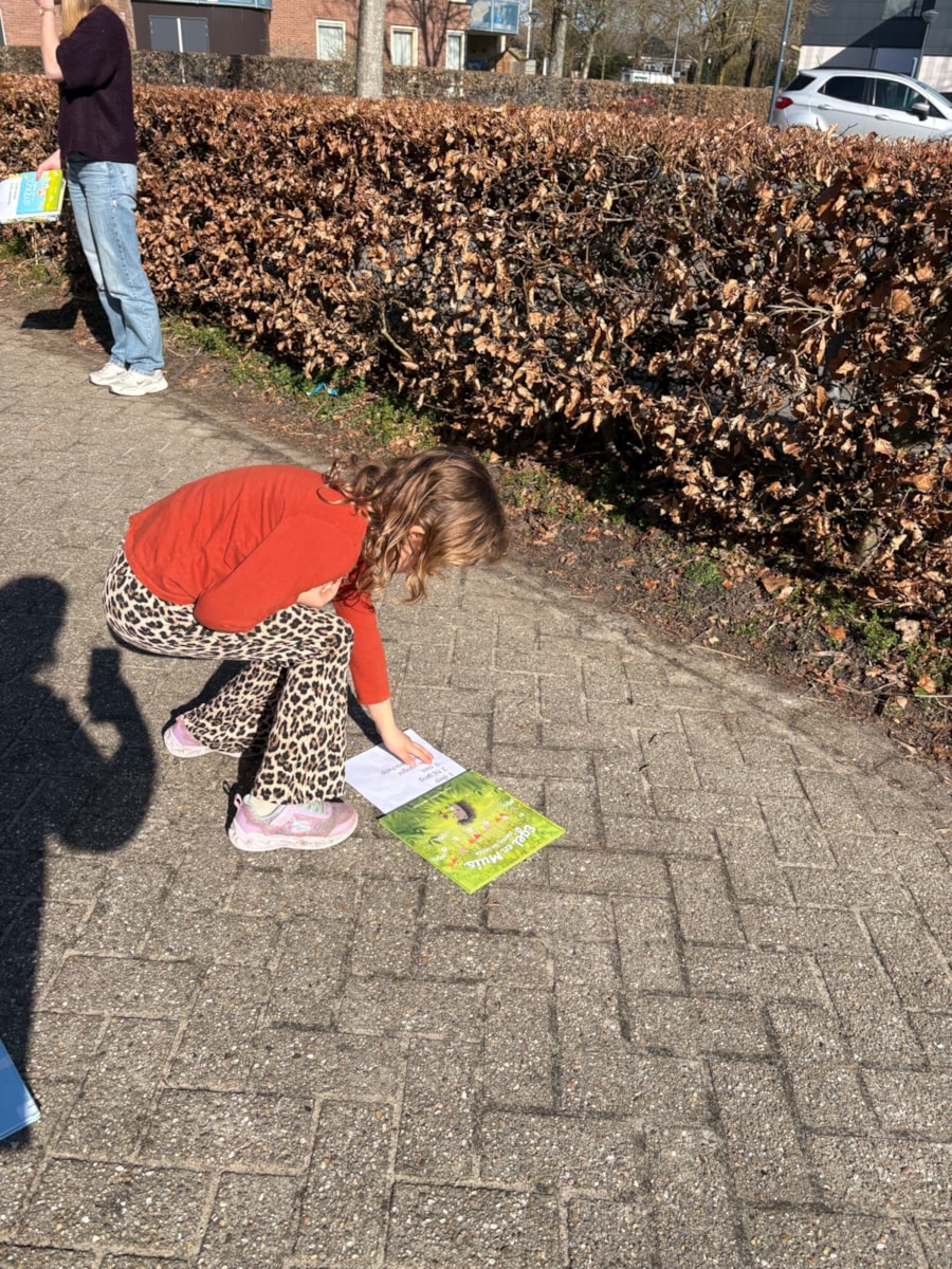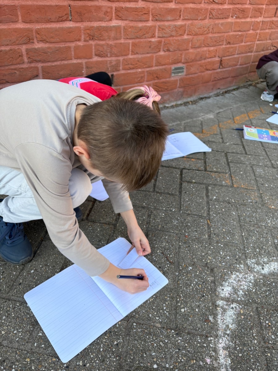 Vandaag was het zo’n heerlijk weertje dat de leerlingen van groep 3 het dictee en de spellingsles buiten hebben gedaan. Het was een bijzonder dictee, want de woorden waren verborgen! Ze werden alleen zichtbaar als je ze tegen de zon inhield.