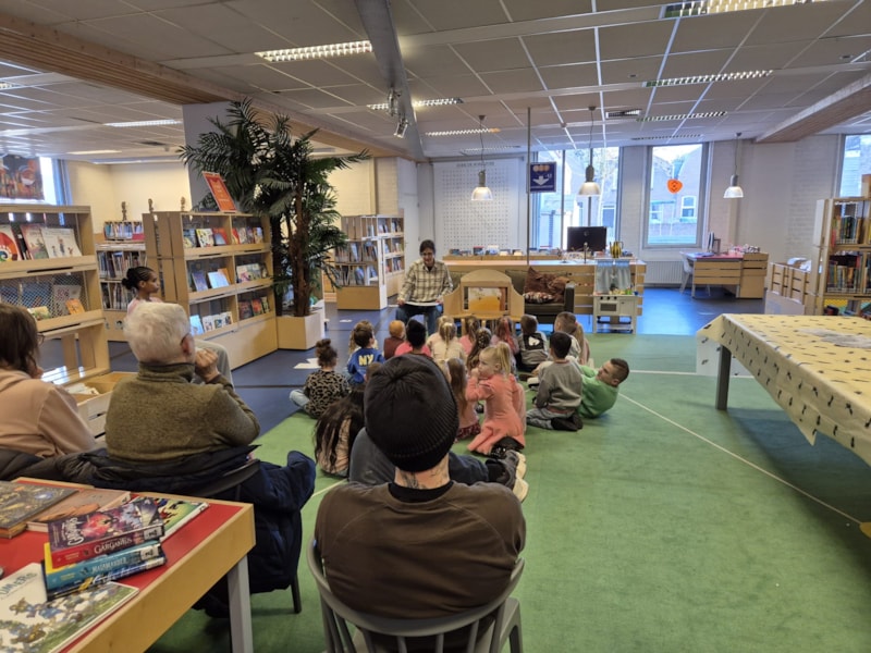 Juf Jasmijn, die ook vaak op school komt voorlezen, was er ook. Zij las het boek ’Kleine aap’ van Mies van Hout voor.