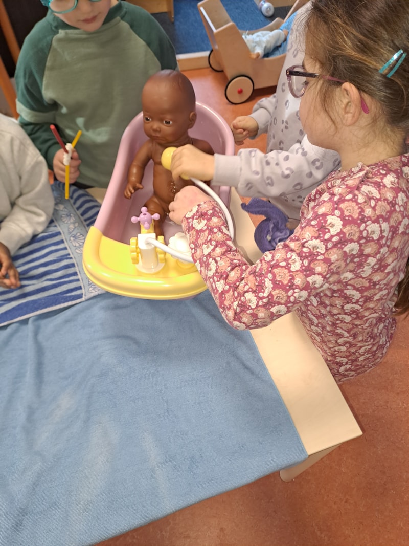 Bij de kleuters wordt de pop in bad gedaan. Lekker warm water en een washandje om te soppen.