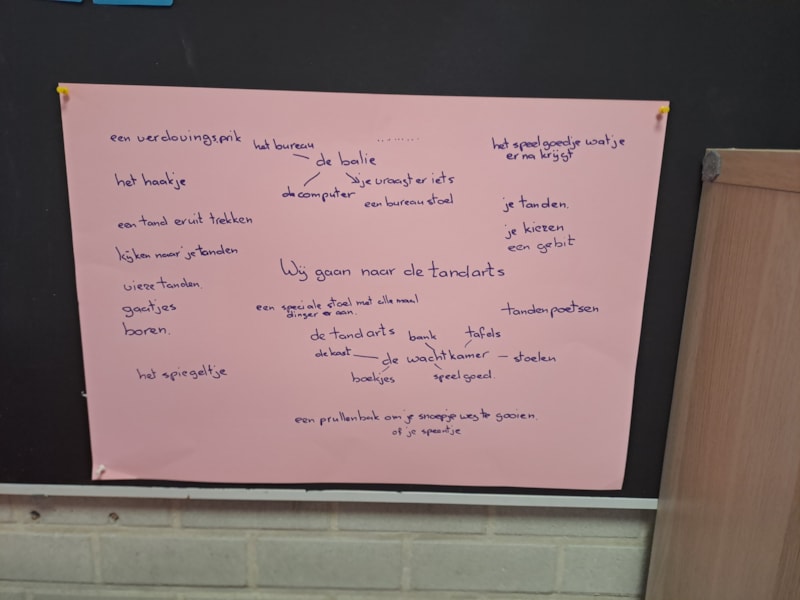De kleuters werken aan het thema ’tandarts ’. Hier zijn heel veel nieuwe woorden over geleerd, zoals assistent en gebit.