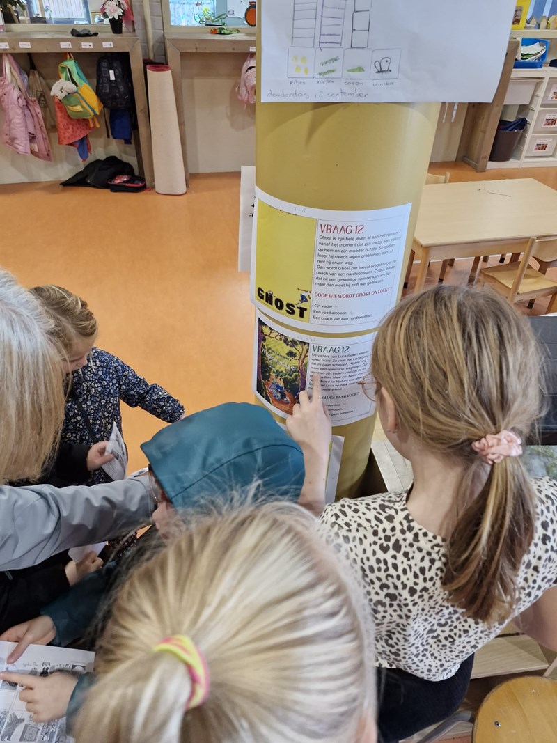 De leerlingen van groep 8 hebben uit andere groepen kinderen opgehaald. Samen hebben ze een speurtocht over boeken gedaan.