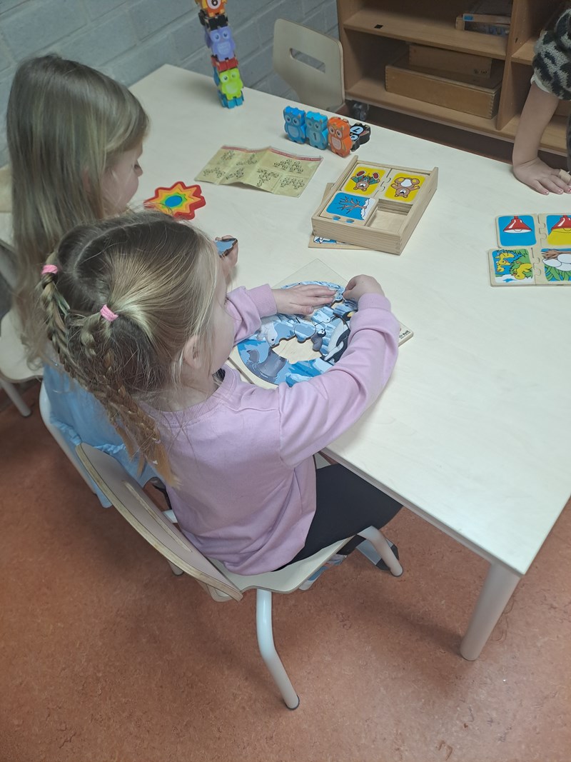 De kleuters zijn lekker bezig met het maken van een muts of wanten of een mooie puzzel.